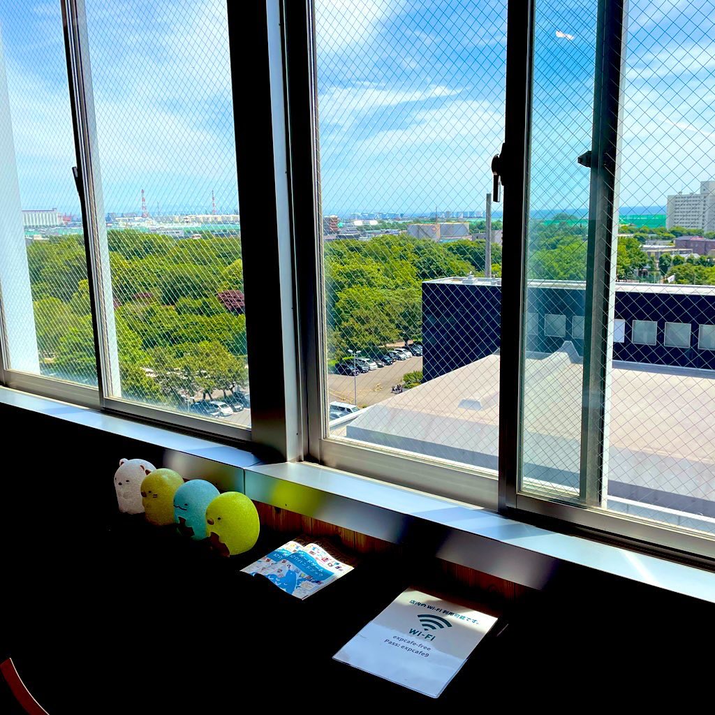 苫小牧市は高層ビルが少ないため、9階からの眺望は格別です。市内の景色はもちろん、遠くには太平洋が広がり、その壮大な景色を楽しむことができます。この景色を眺めながら仕事ができるのは、エクスカフェならではの特権です。苫小牧に初めて来られた方には、ぜひ一度訪れていただきたい場所です。ランチや飲み物を楽しみながら外の景色を眺めることで、気分もリフレッシュされ、午後の仕事も捗ること間違いなし。