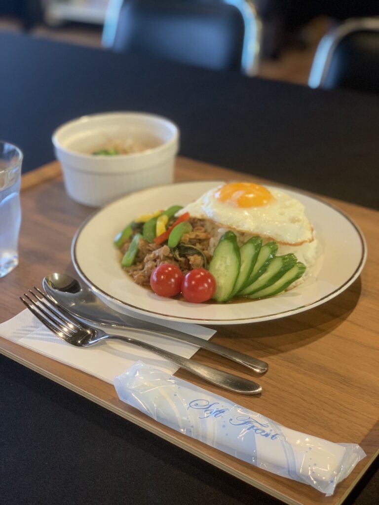 このカフェでは、コーヒーやジュースなど飲み物各種の他、カレーや丼もの等の食事が提供されています。その中でも特に人気なのは、ガパオライス。ボリューム満点でサラダも添えられており、来店した多くのワーカーがこのガパオライスを食べているそう。また、アサイーボウルや、タピオカドリンクなども好評です。