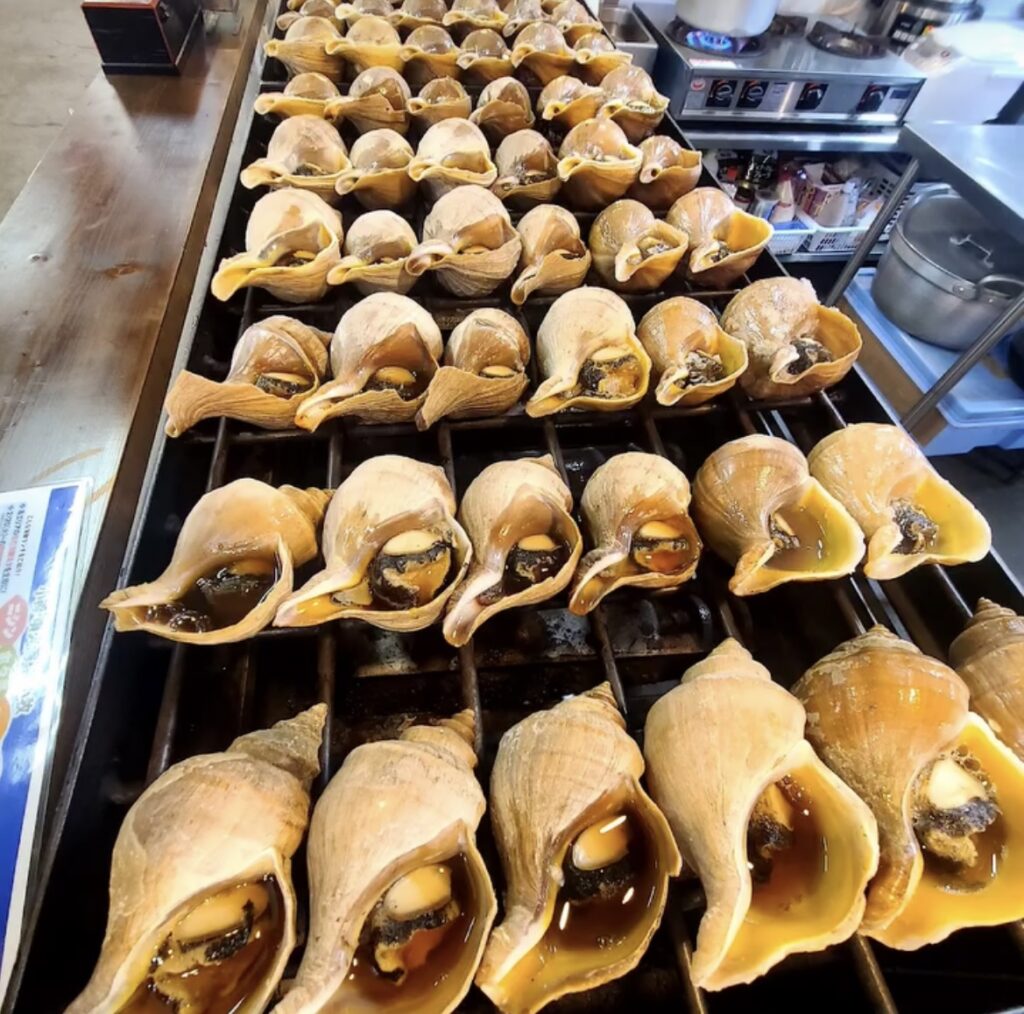名物のつぶ焼きは、苫小牧産のつぶ貝を使用。コリコリとした食感が特徴で、油の処理がされているため、汁まですべて味わえるのが魅力です。焼き台の前に立ち食い用のカウンターがあり、目の前で殻ごと焼かれる様子を楽しみながら手軽に味わうことができます。